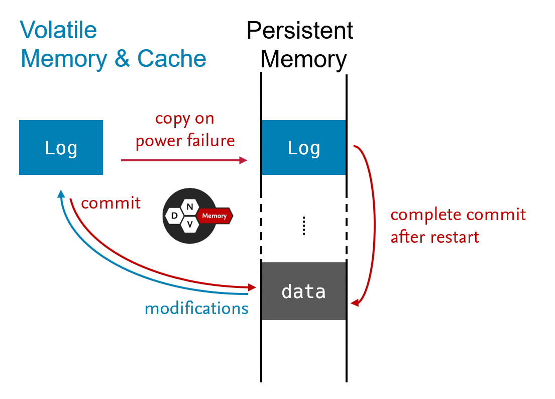 To keep persistent data consistent in the presence of a power failure, our framework provides transactional semantics (see __transaction_atomic {...} in the example above). However, other than previous work, our software transactions are using volatile logs and do not enforce durability on every commit. Only when a power failure is imminent, the transaction logs are copied to persistent memory followed by enforcing durability.