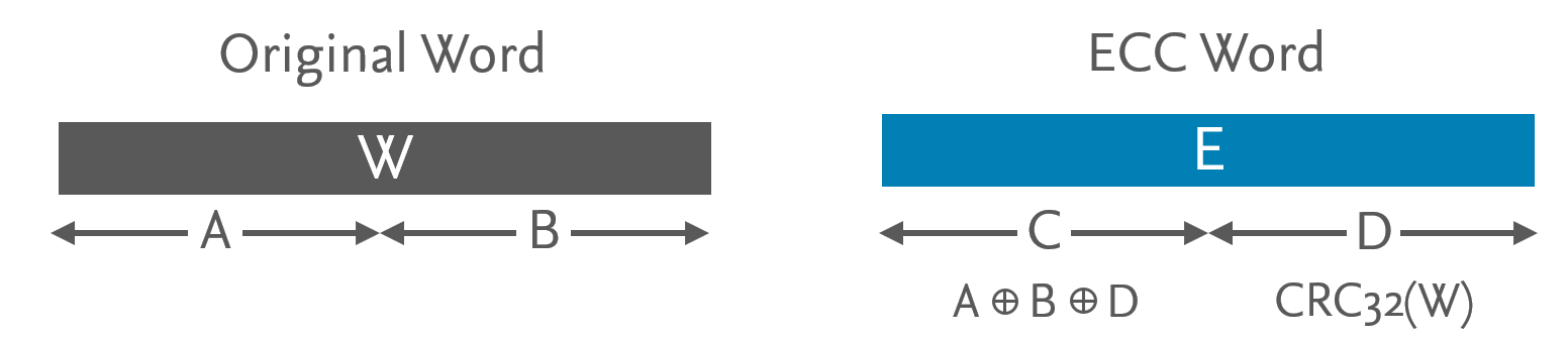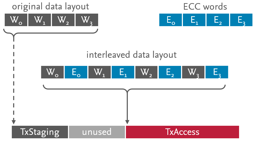 We store the original data and its ECC-Words (E) in an interleaved data layout to optimize for cache efficiency. However, with this layout, any access without transaction may corrupt persistent data. Since accessing persistent data without transactions is inherently unsafe in case of power failures. We add programming support, that prevents unintentional access of persistent data outside a transaction. For this reason two virtual memory sections are introduced. The actual persistent data, interleaved with its ECC, is store in the TxAccess section. Access to this section is obscured from the user because our API never externalizes pointers to this section. Instead, all pointers externalized by DNV Memory are pointing to the TxStaging section, which is mapped without any access rights. That way, accessing persistent memory without using transactions leads to segmentation faults that are easy to debug.