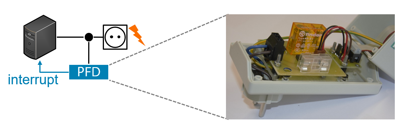 This approach requires the ability to detect power outages in advance, which we do with the help of a hardware power failure detector (PFD). This simple device is plugged into the same power source as the machine. In the case of a voltage drop at the power source, the PFD emits an interrupt to the affected machine. Exploiting the energy that is stored within the power supply, the machine can continue running for a short time to copy the log to persistent memory and enforce durability of persistent data.