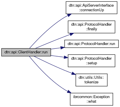References API_STATUS_BAD_REQUEST, API_STATUS_NOT_ACCEPTABLE, API_STATUS_OK, dtn::core::Node::CONN_P2P_BT, dtn::core::Node::CONN_P2P_WIFI, dtn::api::ApiServerInterface::connectionUp(), dtn::api::ProtocolHandler::finally(), IBRCOMMON_LOGGER_ENDL, IBRCOMMON_LOGGER_TAG, dtn::api::ProtocolHandler::run(), dtn::api::ProtocolHandler::setup(), dtn::utils::Utils::tokenize(), and ibrcommon::Exception::what().