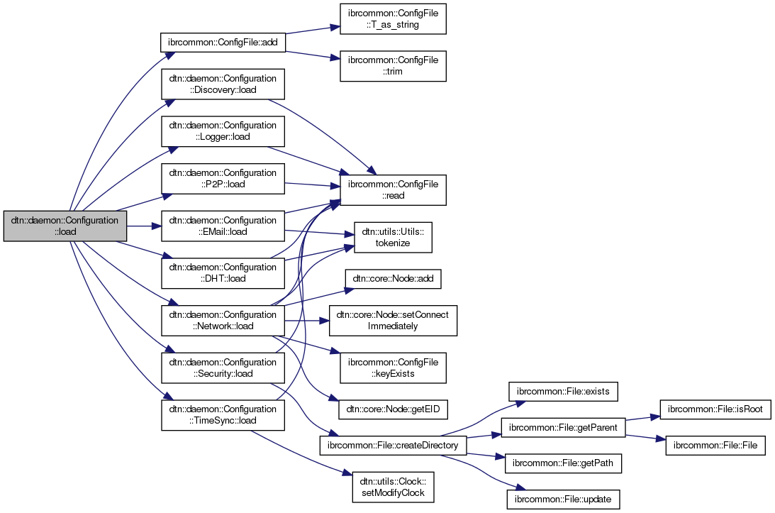 References _debug, ibrcommon::ConfigFile::add(), IBRCOMMON_LOGGER_ENDL, IBRCOMMON_LOGGER_TAG, ibrcommon::LogLevel::info, dtn::daemon::Configuration::Discovery::load(), dtn::daemon::Configuration::Logger::load(), dtn::daemon::Configuration::Network::load(), dtn::daemon::Configuration::Security::load(), dtn::daemon::Configuration::TimeSync::load(), dtn::daemon::Configuration::DHT::load(), dtn::daemon::Configuration::P2P::load(), and dtn::daemon::Configuration::EMail::load().