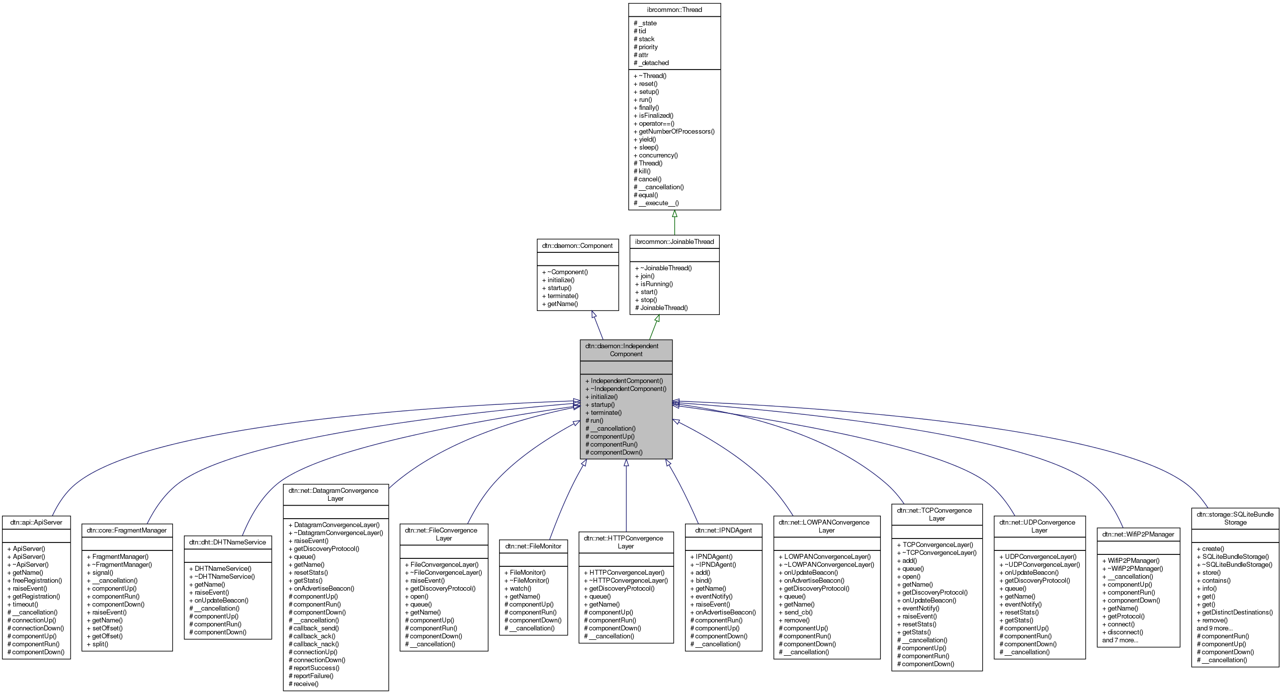 Implemented in dtn::dht::DHTNameService, dtn::storage::SQLiteBundleStorage, dtn::net::TCPConvergenceLayer, dtn::net::DatagramConvergenceLayer, dtn::net::LOWPANConvergenceLayer, dtn::net::HTTPConvergenceLayer, dtn::api::ApiServer, dtn::net::UDPConvergenceLayer, dtn::core::FragmentManager, dtn::net::IPNDAgent, dtn::net::FileMonitor, dtn::net::WifiP2PManager, and dtn::net::FileConvergenceLayer.