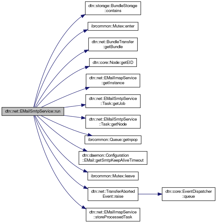 References dtn::storage::BundleStorage::contains(), ibrcommon::Mutex::enter(), ibrcommon::LogLevel::error, dtn::net::BundleTransfer::getBundle(), dtn::core::Node::getEID(), dtn::net::EMailImapService::getInstance(), dtn::net::EMailSmtpService::Task::getJob(), dtn::net::EMailSmtpService::Task::getNode(), ibrcommon::Queue< T >::getnpop(), dtn::daemon::Configuration::EMail::getSmtpKeepAliveTimeout(), IBRCOMMON_LOGGER, IBRCOMMON_LOGGER_ENDL, ibrcommon::Mutex::leave(), dtn::net::TransferAbortedEvent::raise(), dtn::net::TransferAbortedEvent::REASON_CONNECTION_DOWN, dtn::net::TransferAbortedEvent::REASON_UNDEFINED, and dtn::net::EMailImapService::storeProcessedTask().