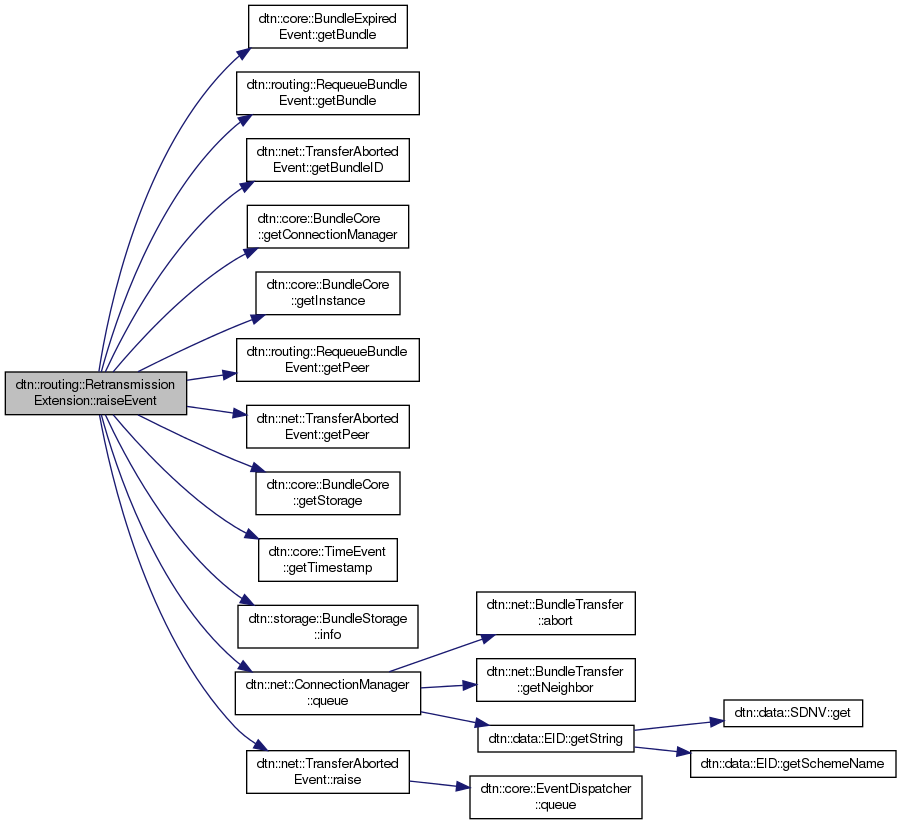 References dtn::core::BundleExpiredEvent::getBundle(), dtn::routing::RequeueBundleEvent::getBundle(), dtn::net::TransferAbortedEvent::getBundleID(), dtn::core::BundleCore::getConnectionManager(), dtn::core::BundleCore::getInstance(), dtn::routing::RequeueBundleEvent::getPeer(), dtn::net::TransferAbortedEvent::getPeer(), dtn::core::BundleCore::getStorage(), dtn::core::TimeEvent::getTimestamp(), dtn::storage::BundleStorage::info(), dtn::net::ConnectionManager::queue(), dtn::net::TransferAbortedEvent::raise(), dtn::net::TransferAbortedEvent::REASON_BUNDLE_DELETED, and dtn::net::TransferAbortedEvent::REASON_RETRY_LIMIT_REACHED.
