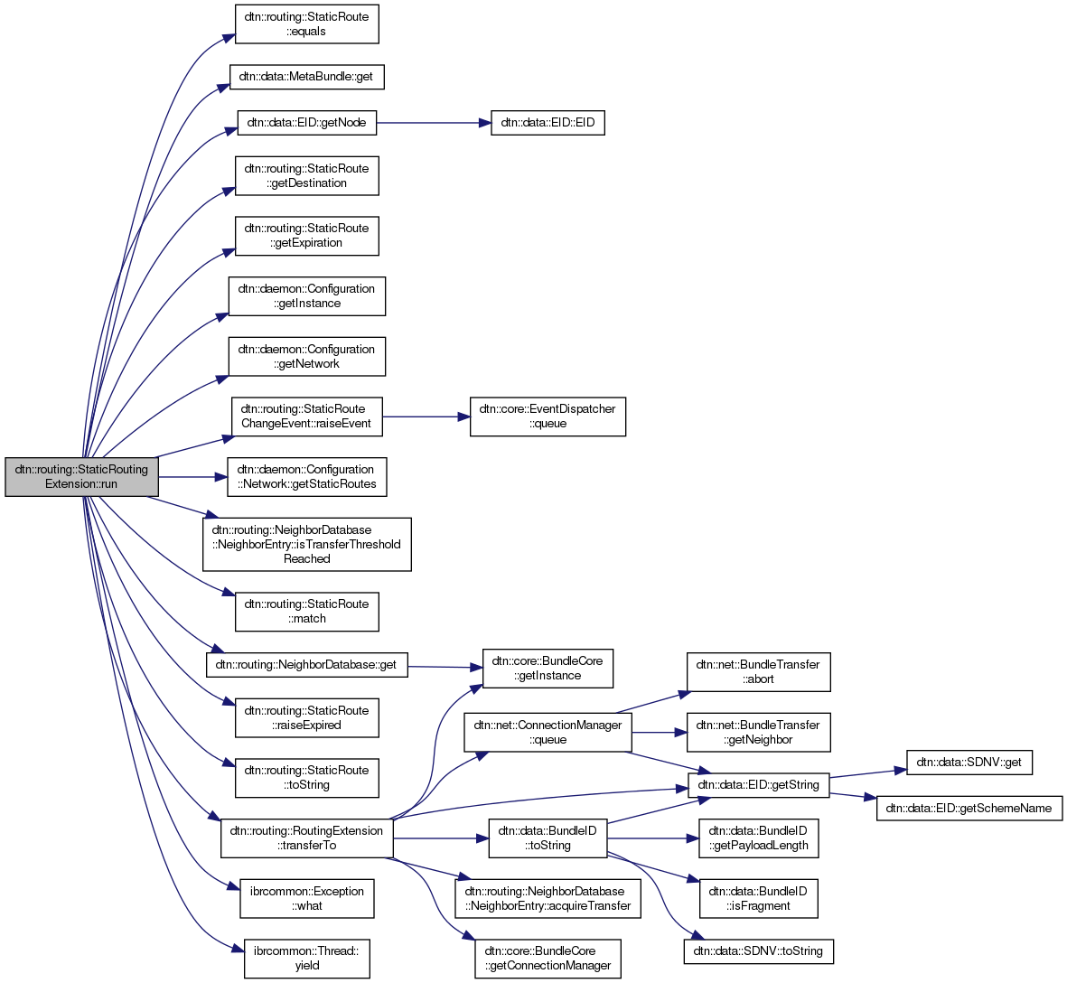 References dtn::data::MetaBundle::destination, dtn::data::PrimaryBlock::DESTINATION_IS_SINGLETON, dtn::routing::StaticRoute::equals(), dtn::data::MetaBundle::get(), dtn::routing::NeighborDatabase::get(), dtn::routing::StaticRoute::getDestination(), dtn::routing::StaticRoute::getExpiration(), dtn::daemon::Configuration::getInstance(), dtn::daemon::Configuration::getNetwork(), dtn::data::EID::getNode(), dtn::daemon::Configuration::Network::getStaticRoutes(), dtn::data::MetaBundle::hopcount, IBRCOMMON_LOGGER_DEBUG_TAG, IBRCOMMON_LOGGER_ENDL, dtn::routing::NeighborDatabase::NeighborEntry::isTransferThresholdReached(), dtn::core::BundleCore::local, dtn::routing::StaticRoute::match(), dtn::routing::StaticRouteChangeEvent::raiseEvent(), dtn::routing::StaticRoute::raiseExpired(), dtn::routing::StaticRouteChangeEvent::ROUTE_ADD, dtn::routing::StaticRoute::toString(), dtn::routing::RoutingExtension::transferTo(), ibrcommon::Exception::what(), and ibrcommon::Thread::yield().