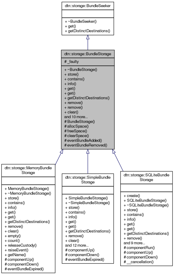 Implemented in dtn::storage::SQLiteBundleStorage, dtn::storage::SimpleBundleStorage, and dtn::storage::MemoryBundleStorage.