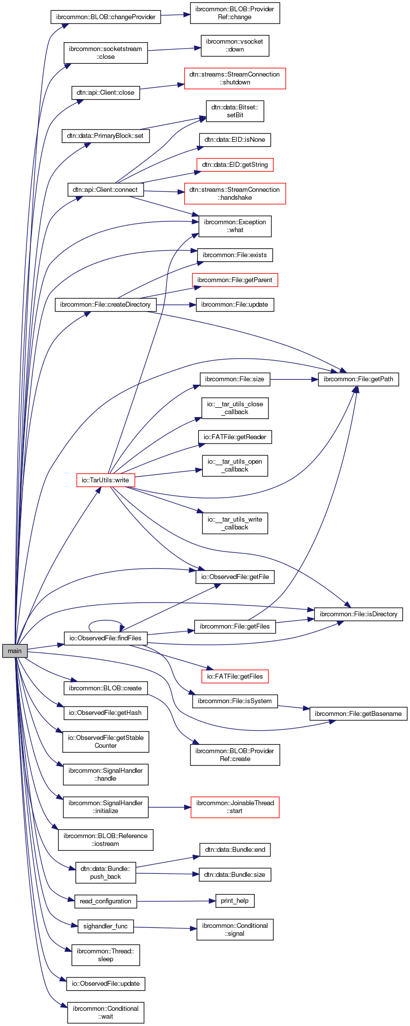 References _running, _wait_abort, blob_path, ibrcommon::BLOB::changeProvider(), ibrcommon::socketstream::close(), dtn::api::Client::close(), dtn::api::Client::connect(), ibrcommon::BLOB::create(), ibrcommon::File::createDirectory(), dtn::data::PrimaryBlock::destination, dtn::data::PrimaryBlock::DESTINATION_IS_SINGLETON, ibrcommon::File::exists(), io::ObservedFile::findFiles(), ibrcommon::File::getBasename(), io::ObservedFile::getFile(), io::ObservedFile::getHash(), ibrcommon::File::getPath(), io::ObservedFile::getStableCounter(), ibrcommon::SignalHandler::handle(), ibrcommon::SignalHandler::initialize(), ibrcommon::BLOB::Reference::iostream(), ibrcommon::File::isDirectory(), dtn::api::Client::MODE_SENDONLY, dtn::data::Bundle::push_back(), read_configuration(), dtn::data::PrimaryBlock::set(), sighandler_func(), ibrcommon::Thread::sleep(), io::ObservedFile::update(), ibrcommon::Conditional::wait(), ibrcommon::Exception::what(), and io::TarUtils::write().