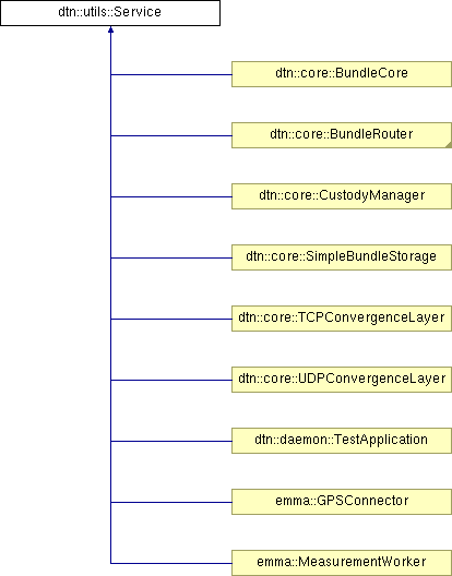 Implemented in dtn::core::BundleCore, dtn::core::BundleRouter, dtn::core::CustodyManager, dtn::core::SimpleBundleStorage, dtn::core::TCPConvergenceLayer, dtn::core::UDPConvergenceLayer, dtn::daemon::TestApplication, emma::GPSConnector, and emma::MeasurementWorker.