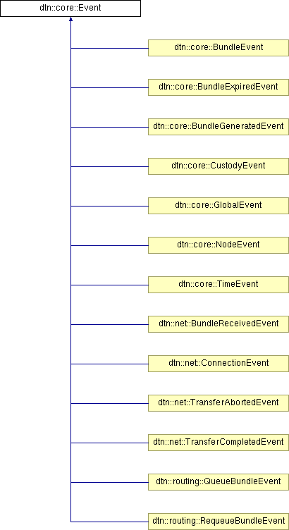 Implemented in dtn::core::BundleEvent, dtn::core::BundleExpiredEvent, dtn::core::BundleGeneratedEvent, dtn::core::CustodyEvent, dtn::core::GlobalEvent, dtn::core::NodeEvent, dtn::core::TimeEvent, dtn::net::BundleReceivedEvent, dtn::net::ConnectionEvent, dtn::net::TransferAbortedEvent, dtn::net::TransferCompletedEvent, dtn::routing::QueueBundleEvent, and dtn::routing::RequeueBundleEvent.
