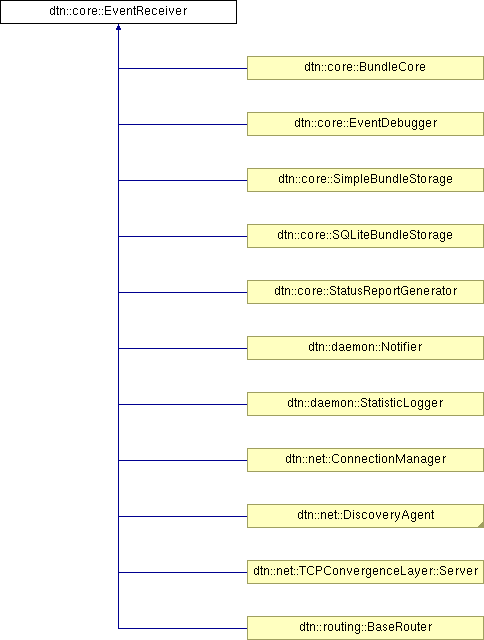 Implemented in dtn::core::BundleCore, dtn::core::EventDebugger, dtn::core::SimpleBundleStorage, dtn::core::SQLiteBundleStorage, dtn::core::StatusReportGenerator, dtn::net::ConnectionManager, dtn::net::DiscoveryAgent, dtn::net::TCPConvergenceLayer::Server, dtn::daemon::Notifier, dtn::routing::BaseRouter, and dtn::daemon::StatisticLogger.