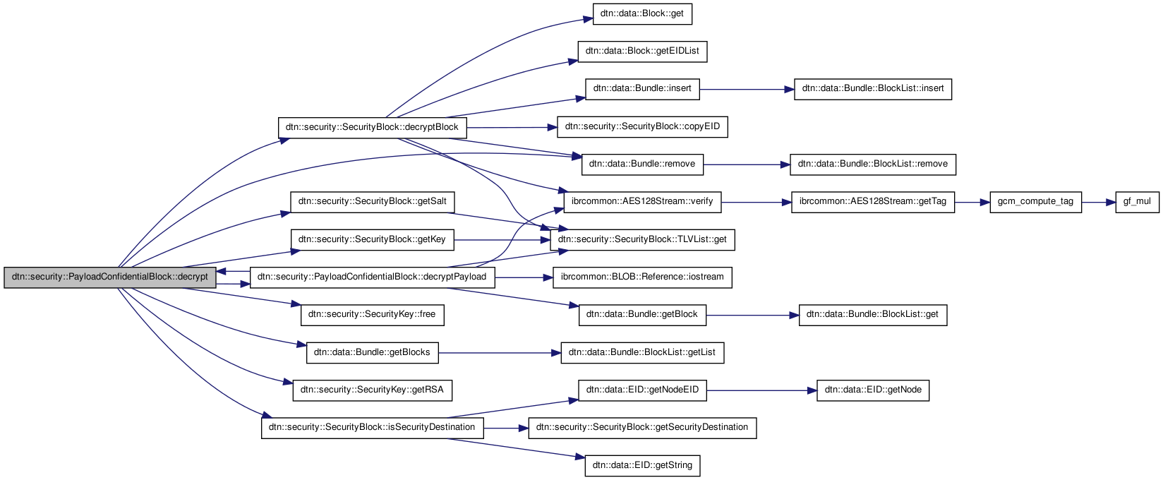References dtn::security::SecurityBlock::_ciphersuite_flags, dtn::security::SecurityBlock::_ciphersuite_id, dtn::security::SecurityBlock::_ciphersuite_params, dtn::security::SecurityBlock::_correlator, dtn::security::SecurityBlock::CONTAINS_CORRELATOR, dtn::security::SecurityBlock::decryptBlock(), decryptPayload(), dtn::security::SecurityKey::free(), dtn::data::Bundle::getBlocks(), dtn::security::SecurityBlock::getKey(), dtn::security::SecurityKey::getRSA(), dtn::security::SecurityBlock::getSalt(), IBRCOMMON_LOGGER, dtn::security::SecurityBlock::isSecurityDestination(), ibrcommon::AES128Stream::key_size_in_bytes, dtn::security::SecurityKey::reference, dtn::data::Bundle::remove(), and dtn::security::SecurityBlock::salt.