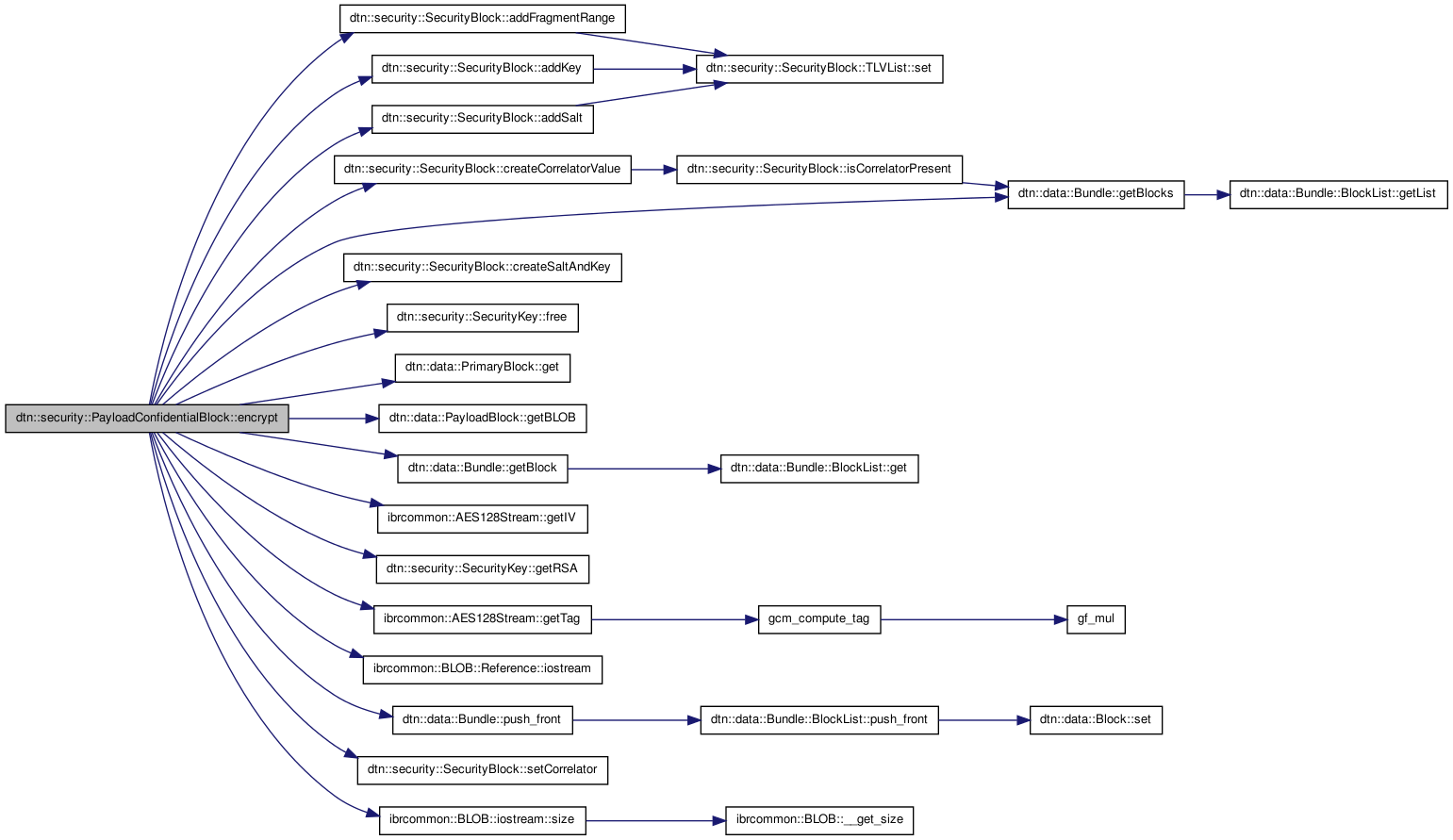The PayloadConfidentialBlock encrypts the payload, PayloadConfidentialBlocks, which are already there and PayloadIntegrityBlocks, which are already there. Payload Confidential or Integrity Blocks are encrypted because they can contain e.g. signatures which make guessing the plaintext easier. You can instantiate a factory, which will take care of everything. The factory can be given a rsa key and the corresponding node. You may wish to add more keys using addDestination(), so one or more nodes are able to recover the payload. For each destination a PayloadConfidentialBlock is placed in the bundle, when calling encrypt(). Be sure, that no other PayloadConfidentialBlocks or PayloadIntegrityBlocks are inside this bundle if using encryption with more than one key.