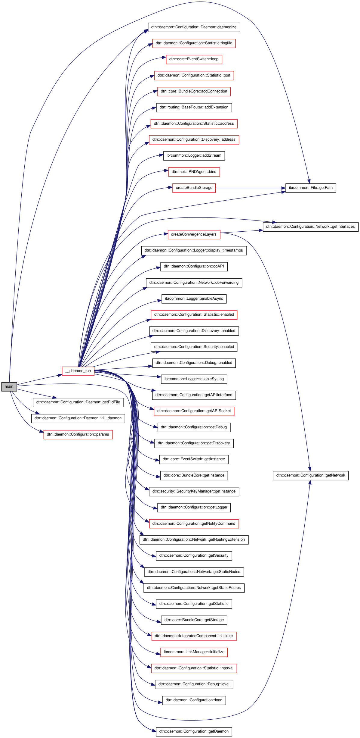 References _debug, dtn::core::BundleCore::addConnection(), dtn::routing::BaseRouter::addExtension(), dtn::daemon::Configuration::Statistic::address(), dtn::daemon::Configuration::Discovery::address(), ibrcommon::Logger::addStream(), dtn::net::IPNDAgent::bind(), createBundleStorage(), createConvergenceLayers(), dtn::daemon::Configuration::Daemon::daemonize(), dtn::daemon::Configuration::Logger::display_timestamps(), dtn::daemon::Configuration::doAPI(), dtn::daemon::Configuration::Network::doForwarding(), ibrcommon::Logger::enableAsync(), dtn::daemon::Configuration::Statistic::enabled(), dtn::daemon::Configuration::Discovery::enabled(), dtn::daemon::Configuration::Security::enabled(), dtn::daemon::Configuration::Debug::enabled(), ibrcommon::Logger::enableSyslog(), dtn::core::BundleCore::forwarding, dtn::daemon::Configuration::getAPIInterface(), dtn::daemon::Configuration::getAPISocket(), dtn::daemon::Configuration::getDaemon(), dtn::daemon::Configuration::getDebug(), dtn::daemon::Configuration::getDiscovery(), dtn::core::EventSwitch::getInstance(), dtn::core::BundleCore::getInstance(), dtn::security::SecurityKeyManager::getInstance(), dtn::daemon::Configuration::Network::getInterfaces(), dtn::daemon::Configuration::getLogger(), dtn::daemon::Configuration::getNetwork(), dtn::daemon::Configuration::getNotifyCommand(), ibrcommon::File::getPath(), dtn::daemon::Configuration::Network::getRoutingExtension(), dtn::daemon::Configuration::getSecurity(), dtn::daemon::Configuration::Network::getStaticNodes(), dtn::daemon::Configuration::Network::getStaticRoutes(), dtn::daemon::Configuration::getStatistic(), dtn::core::BundleCore::getStorage(), dtn::core::GlobalEvent::GLOBAL_SHUTDOWN, IBRCOMMON_LOGGER, IBRCOMMON_LOGGER_DEBUG, dtn::daemon::IntegratedComponent::initialize(), ibrcommon::LinkManager::initialize(), dtn::daemon::Configuration::NetConfig::interface, dtn::daemon::Configuration::Statistic::interval(), dtn::daemon::Configuration::Debug::level(), dtn::daemon::Configuration::load(), logerr, dtn::daemon::Configuration::Statistic::logfile(), ibrcommon::Logger::LOGGER_DEBUG, dtn::daemon::StatisticLogger::LOGGER_FILE_CSV, dtn::daemon::StatisticLogger::LOGGER_FILE_PLAIN, dtn::daemon::StatisticLogger::LOGGER_FILE_STAT, dtn::daemon::StatisticLogger::LOGGER_STDOUT, dtn::daemon::StatisticLogger::LOGGER_SYSLOG, dtn::daemon::StatisticLogger::LOGGER_UDP, logopts, logstd, logsys, dtn::core::EventSwitch::loop(), dtn::daemon::Configuration::Statistic::port(), dtn::daemon::Configuration::NetConfig::port, dtn::daemon::Configuration::Discovery::port(), dtn::daemon::Configuration::Debug::quiet(), dtn::core::GlobalEvent::raise(), setGlobalVars(), ibrcommon::Logger::setVerbosity(), sighandler(), dtn::daemon::IntegratedComponent::startup(), ibrcommon::Logger::stop(), switchUser(), dtn::daemon::IntegratedComponent::terminate(), ibrcommon::vinterface::toString(), dtn::daemon::Configuration::Statistic::type(), ibrcommon::vaddress::VADDRESS_INET, and dtn::daemon::Configuration::version().