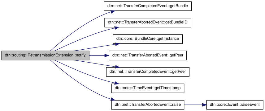 References dtn::core::BundleExpiredEvent::_bundle, dtn::routing::RequeueBundleEvent::_bundle, dtn::routing::RequeueBundleEvent::_peer, dtn::net::TransferCompletedEvent::getBundle(), dtn::net::TransferAbortedEvent::getBundleID(), dtn::core::BundleCore::getInstance(), dtn::net::TransferAbortedEvent::getPeer(), dtn::net::TransferCompletedEvent::getPeer(), dtn::core::TimeEvent::getTimestamp(), dtn::net::TransferAbortedEvent::raise(), dtn::net::TransferAbortedEvent::REASON_BUNDLE_DELETED, and dtn::net::TransferAbortedEvent::REASON_RETRY_LIMIT_REACHED.