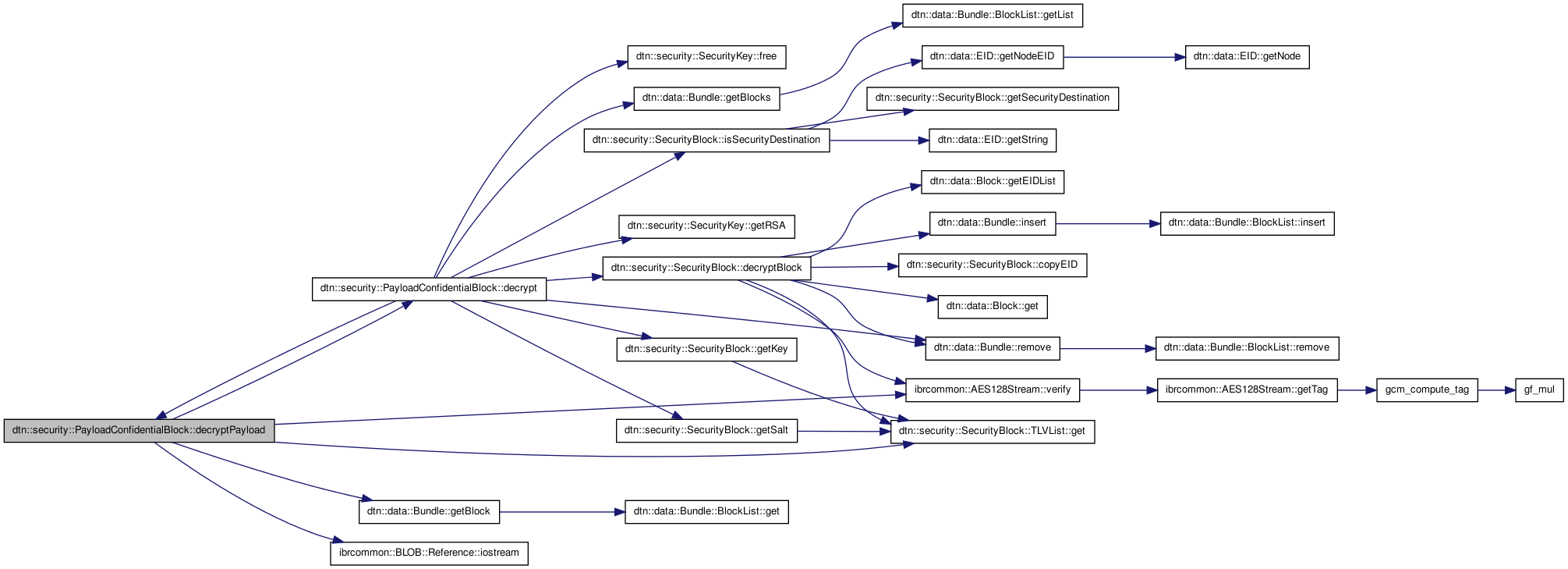 References dtn::security::SecurityBlock::_ciphersuite_flags, dtn::security::SecurityBlock::_ciphersuite_id, dtn::security::SecurityBlock::_ciphersuite_params, dtn::security::SecurityBlock::_correlator, dtn::security::SecurityBlock::CONTAINS_CORRELATOR, dtn::security::SecurityBlock::decryptBlock(), decryptPayload(), dtn::security::SecurityKey::free(), dtn::data::Bundle::getBlocks(), dtn::security::SecurityBlock::getKey(), dtn::security::SecurityKey::getRSA(), dtn::security::SecurityBlock::getSalt(), IBRCOMMON_LOGGER, dtn::security::SecurityBlock::isSecurityDestination(), ibrcommon::AES128Stream::key_size_in_bytes, dtn::security::SecurityKey::reference, dtn::data::Bundle::remove(), and dtn::security::SecurityBlock::salt.