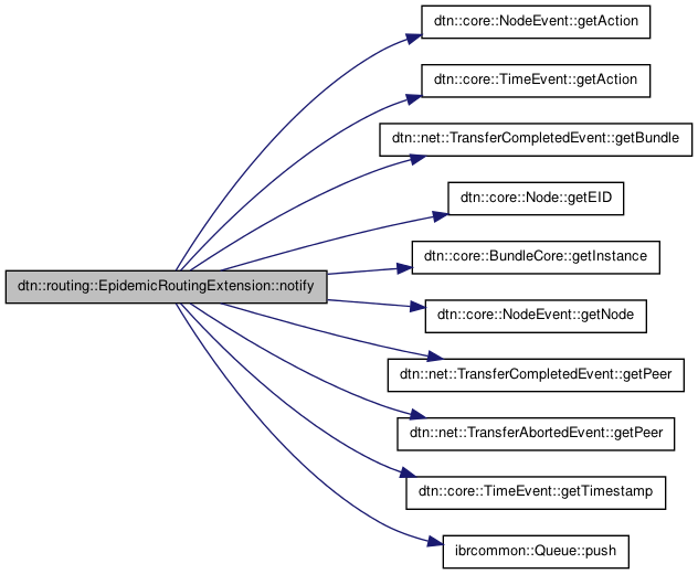 References dtn::core::NodeEvent::getAction(), dtn::core::TimeEvent::getAction(), dtn::net::TransferCompletedEvent::getBundle(), dtn::core::Node::getEID(), dtn::core::BundleCore::getInstance(), dtn::core::NodeEvent::getNode(), dtn::net::TransferCompletedEvent::getPeer(), dtn::net::TransferAbortedEvent::getPeer(), dtn::core::TimeEvent::getTimestamp(), dtn::core::NODE_AVAILABLE, ibrcommon::Queue< T >::push(), and dtn::core::TIME_SECOND_TICK.