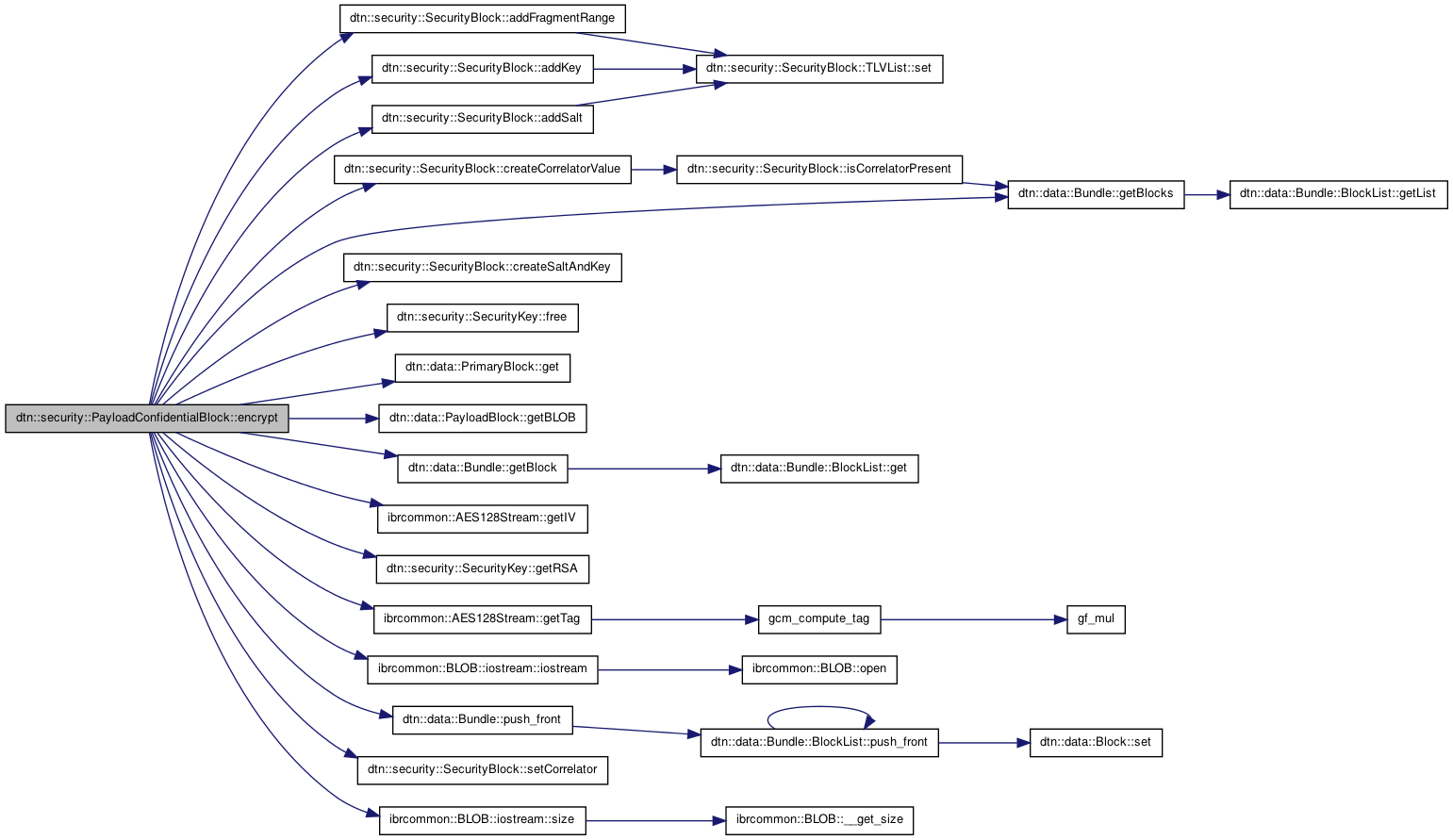 The PayloadConfidentialBlock encrypts the payload, PayloadConfidentialBlocks, which are already there and PayloadIntegrityBlocks, which are already there. Payload Confidential or Integrity Blocks are encrypted because they can contain e.g. signatures which make guessing the plaintext easier. You can instantiate a factory, which will take care of everything. The factory can be given a rsa key and the corresponding node. You may wish to add more keys using addDestination(), so one or more nodes are able to recover the payload. For each destination a PayloadConfidentialBlock is placed in the bundle, when calling encrypt(). Be sure, that no other PayloadConfidentialBlocks or PayloadIntegrityBlocks are inside this bundle if using encryption with more than one key.