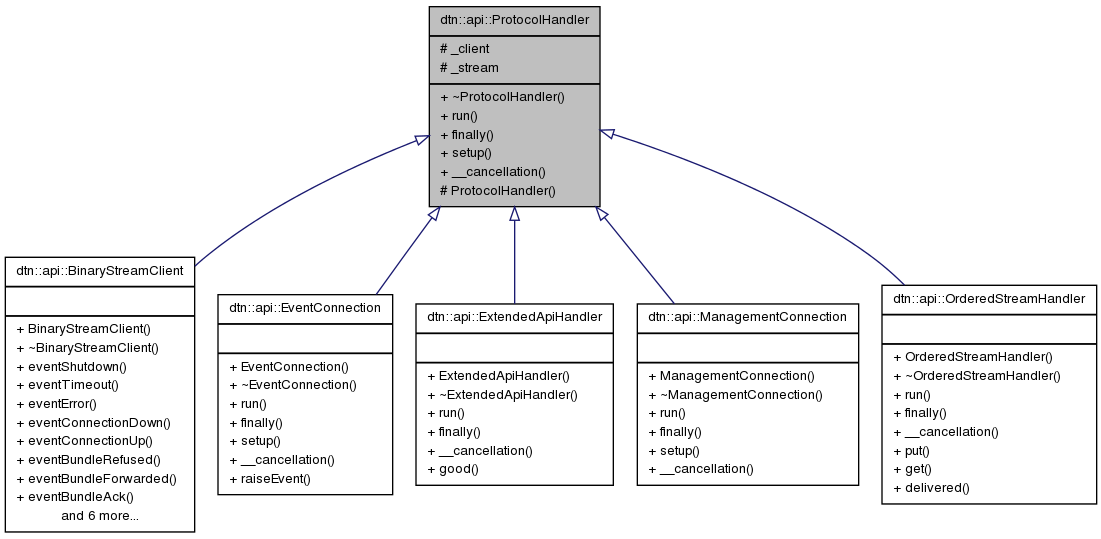 Implemented in dtn::api::BinaryStreamClient, dtn::api::ExtendedApiHandler, dtn::api::OrderedStreamHandler, dtn::api::EventConnection, and dtn::api::ManagementConnection.