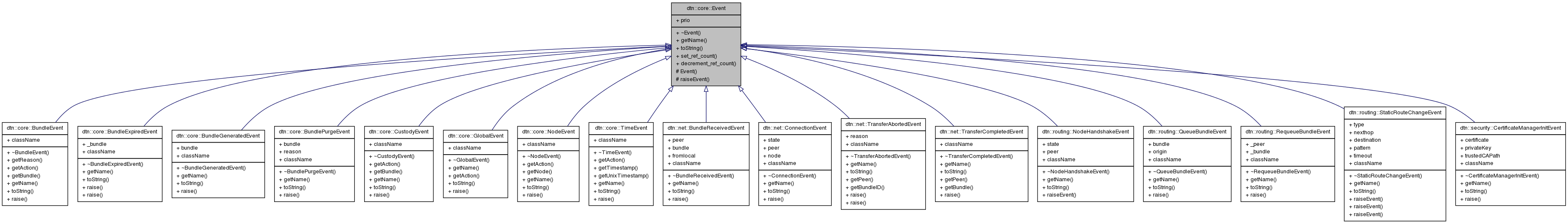 Implemented in dtn::core::BundleEvent, dtn::core::GlobalEvent, dtn::core::CustodyEvent, dtn::core::NodeEvent, dtn::net::TransferAbortedEvent, dtn::security::CertificateManagerInitEvent, dtn::core::TimeEvent, dtn::net::ConnectionEvent, dtn::routing::StaticRouteChangeEvent, dtn::routing::NodeHandshakeEvent, dtn::core::BundleExpiredEvent, dtn::routing::QueueBundleEvent, dtn::net::BundleReceivedEvent, dtn::net::TransferCompletedEvent, dtn::routing::RequeueBundleEvent, dtn::core::BundleGeneratedEvent, and dtn::core::BundlePurgeEvent.