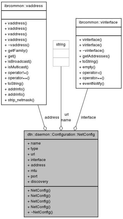 | NetConfig (std::string name, NetType type, const ibrcommon::vaddress &address, int port, bool discovery=true) | |