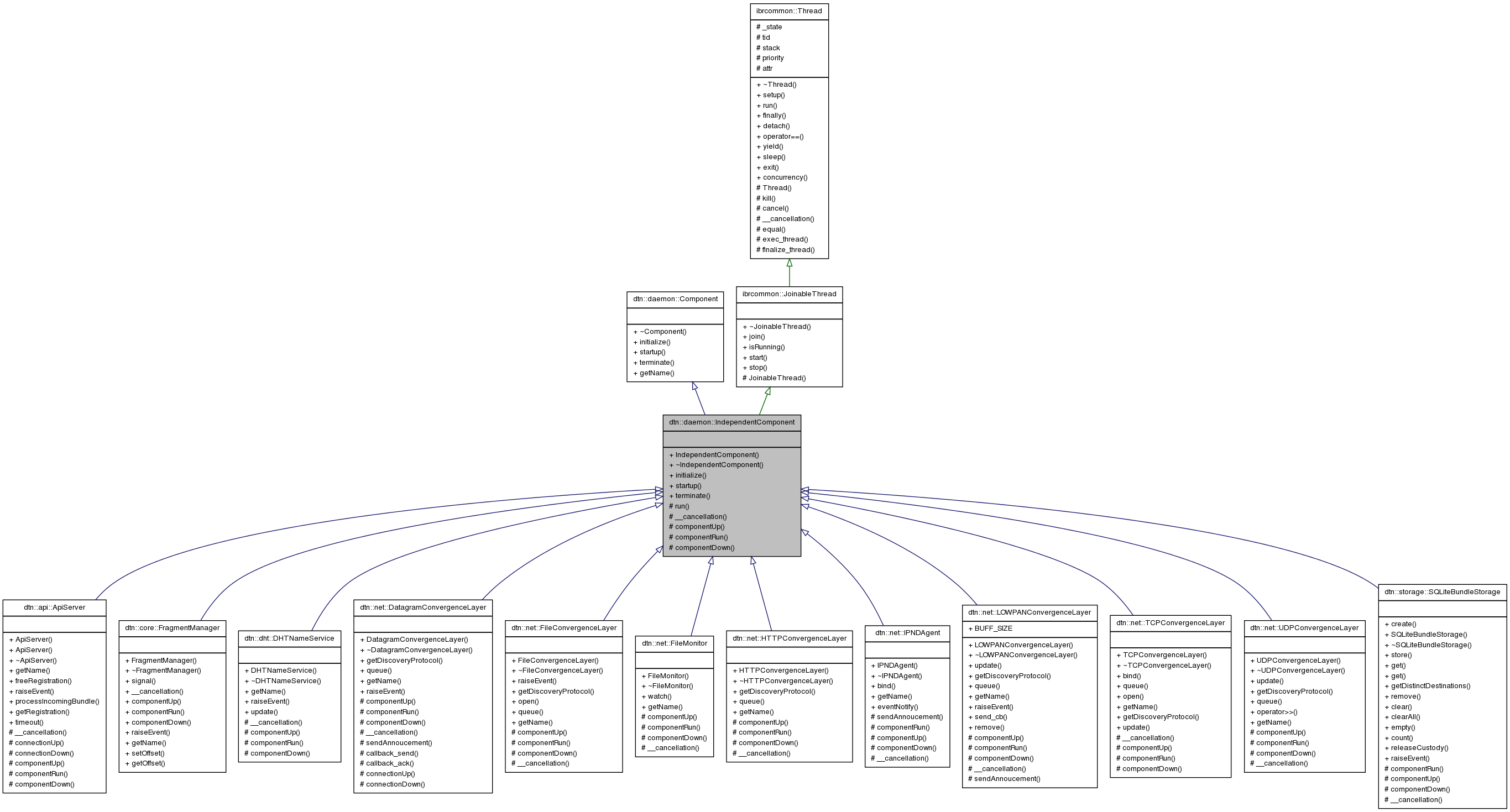 Implemented in dtn::net::TCPConvergenceLayer, dtn::dht::DHTNameService, dtn::net::DatagramConvergenceLayer, dtn::storage::SQLiteBundleStorage, dtn::net::HTTPConvergenceLayer, dtn::api::ApiServer, dtn::net::LOWPANConvergenceLayer, dtn::net::UDPConvergenceLayer, dtn::net::IPNDAgent, dtn::net::FileConvergenceLayer, dtn::core::FragmentManager, and dtn::net::FileMonitor.