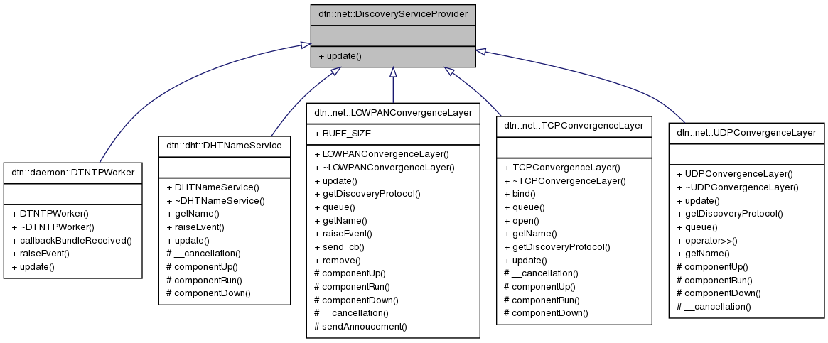 Implemented in dtn::net::TCPConvergenceLayer, dtn::dht::DHTNameService, dtn::net::UDPConvergenceLayer, dtn::net::LOWPANConvergenceLayer, and dtn::daemon::DTNTPWorker.