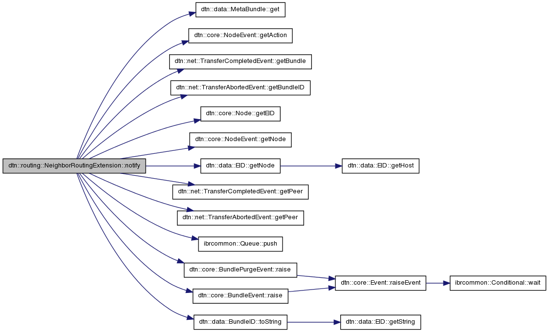 References dtn::routing::QueueBundleEvent::bundle, dtn::core::BUNDLE_DELETED, dtn::net::ConnectionEvent::CONNECTION_UP, dtn::data::StatusReportBlock::DEPLETED_STORAGE, dtn::data::MetaBundle::destination, dtn::data::PrimaryBlock::DESTINATION_IS_SINGLETON, dtn::data::MetaBundle::get(), dtn::core::NodeEvent::getAction(), dtn::net::TransferCompletedEvent::getBundle(), dtn::net::TransferAbortedEvent::getBundleID(), dtn::core::Node::getEID(), dtn::core::NodeEvent::getNode(), dtn::data::EID::getNode(), dtn::net::TransferCompletedEvent::getPeer(), dtn::net::TransferAbortedEvent::getPeer(), IBRCOMMON_LOGGER, IBRCOMMON_LOGGER_ENDL, dtn::data::StatusReportBlock::NO_KNOWN_ROUTE_TO_DESTINATION_FROM_HERE, dtn::core::NODE_AVAILABLE, dtn::routing::QueueBundleEvent::origin, dtn::net::ConnectionEvent::peer, dtn::data::MetaBundle::procflags, ibrcommon::Queue< T >::push(), dtn::core::BundlePurgeEvent::raise(), dtn::core::BundleEvent::raise(), dtn::net::TransferAbortedEvent::reason, dtn::net::TransferAbortedEvent::REASON_BUNDLE_DELETED, dtn::net::TransferAbortedEvent::REASON_CONNECTION_DOWN, dtn::net::TransferAbortedEvent::REASON_REFUSED, dtn::net::TransferAbortedEvent::REASON_RETRY_LIMIT_REACHED, dtn::net::TransferAbortedEvent::REASON_UNDEFINED, dtn::net::ConnectionEvent::state, and dtn::data::BundleID::toString().