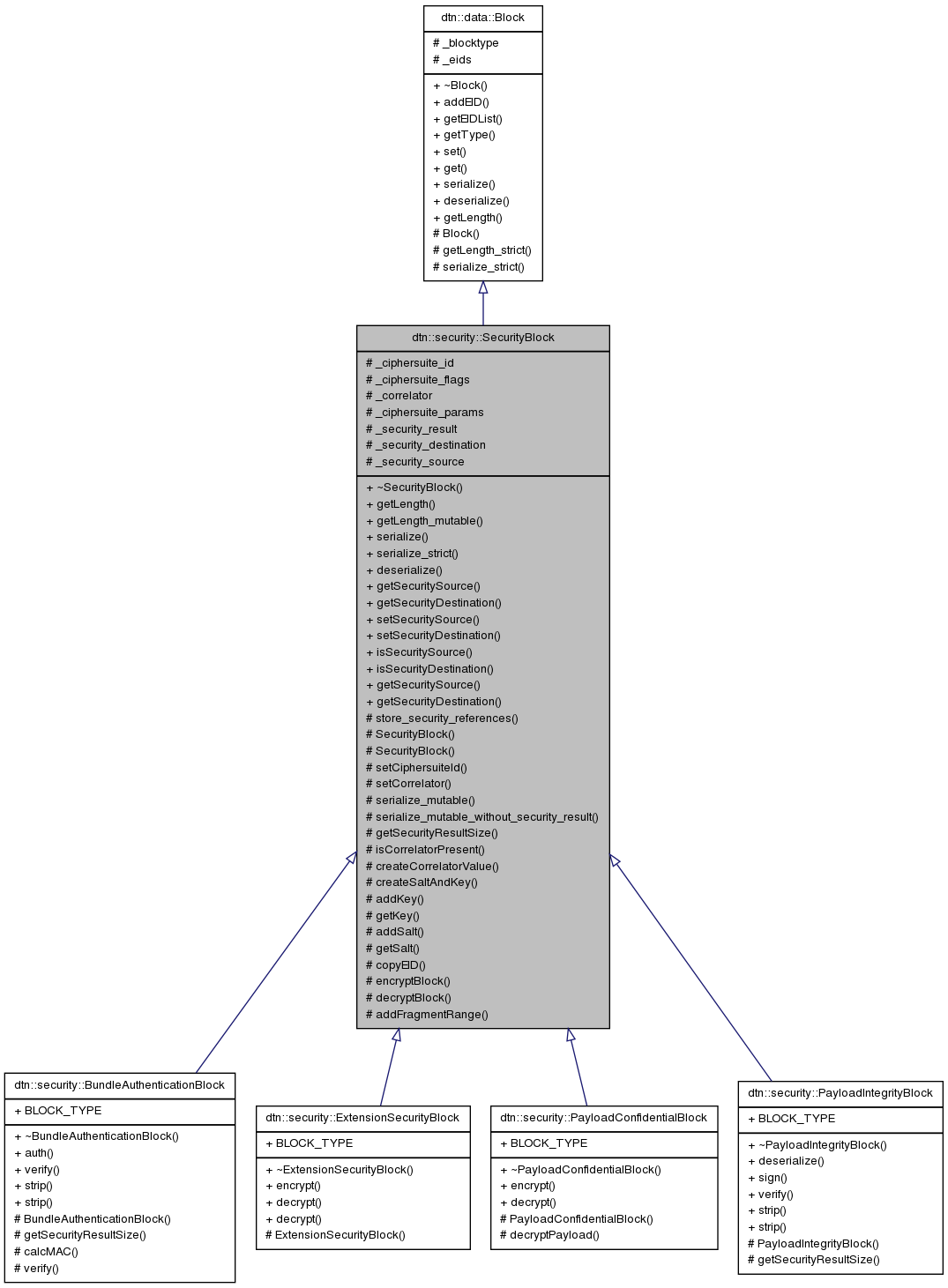 Abstract base class for BundleAuthenticationBlock, PayloadIntegrityBlock, PayloadConfidentialBlock and ExtensionSecurityBlock. It provides definitions of constants and basic functions, which are shared among the blocks. These blocks can be serialized in three forms. In normal form, which is needed for transmission, in strict canonical form, which is need for the BundleAuthenticationBlock and in mutable canonical form. In strict canonical form the security result can be set to be ignored. In mutable canonical form all SDNVs are unpacked to 8 byte fields, numbers written in network byte order and even the security result may be ignored, too. Because the size of security result of the children cannot be known in advance, the children have to implement a method for getting this size.