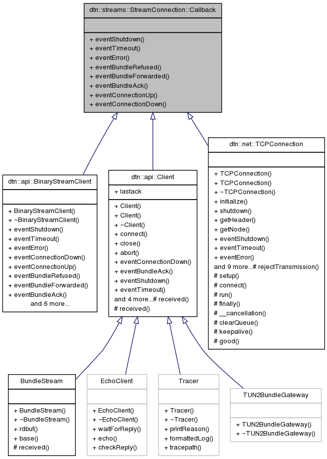 Implemented in dtn::api::Client, dtn::net::TCPConnection, and dtn::api::BinaryStreamClient.