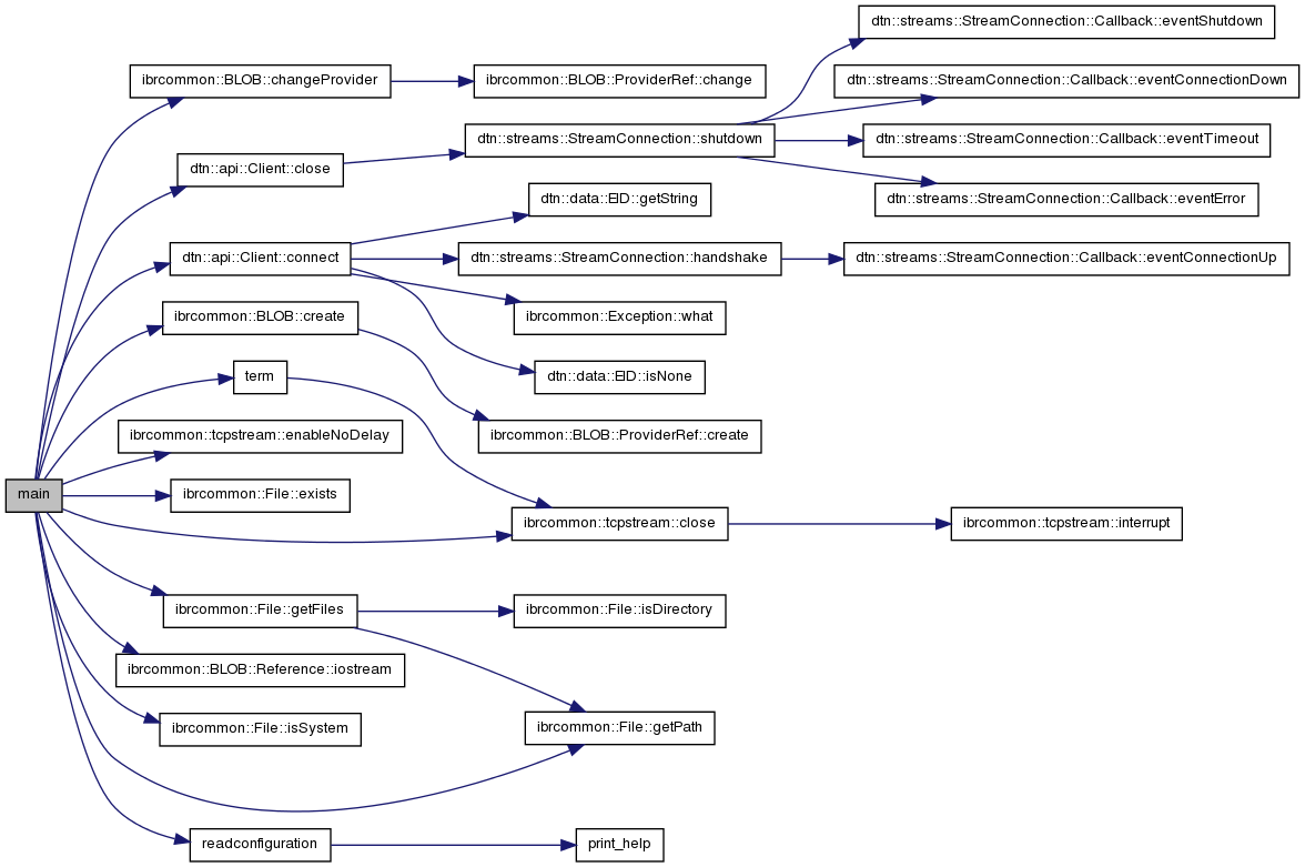 References _conn, _running, blob_path, ibrcommon::BLOB::changeProvider(), ibrcommon::tcpstream::close(), dtn::api::Client::close(), dtn::api::Client::connect(), ibrcommon::BLOB::create(), ibrcommon::tcpstream::enableNoDelay(), ibrcommon::File::exists(), ibrcommon::File::getFiles(), ibrcommon::File::getPath(), ibrcommon::BLOB::Reference::iostream(), ibrcommon::File::isSystem(), ibrcommon::appstreambuf::MODE_READ, dtn::api::Client::MODE_SENDONLY, readconfiguration(), and term().
