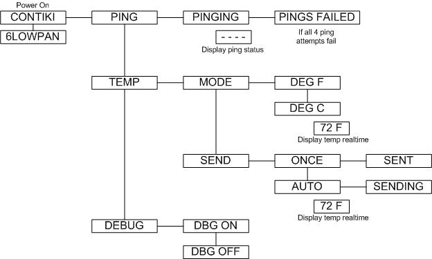 Operating the menu requires that the matching command set has been programmed into the ATmega1284 application. This will allow the menu to communicate properly and control the Contiki 6LoWPAN applcation on the 1284p.