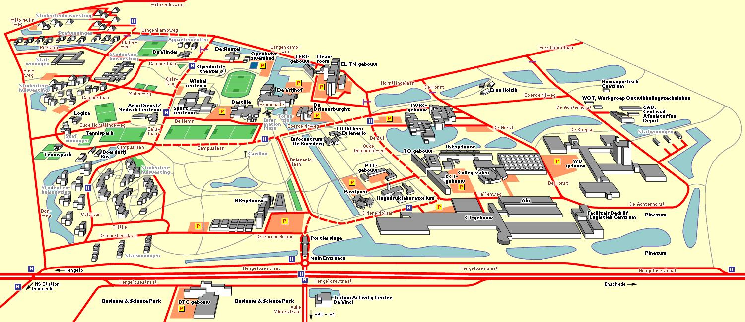 (Turn right after passing the main entrance and go straight ahead. Do not turn left at the KCT-gebouw. Instead go ahead until you see a parking lot on the left. Turn left and go straight to the INF-gebouw.)