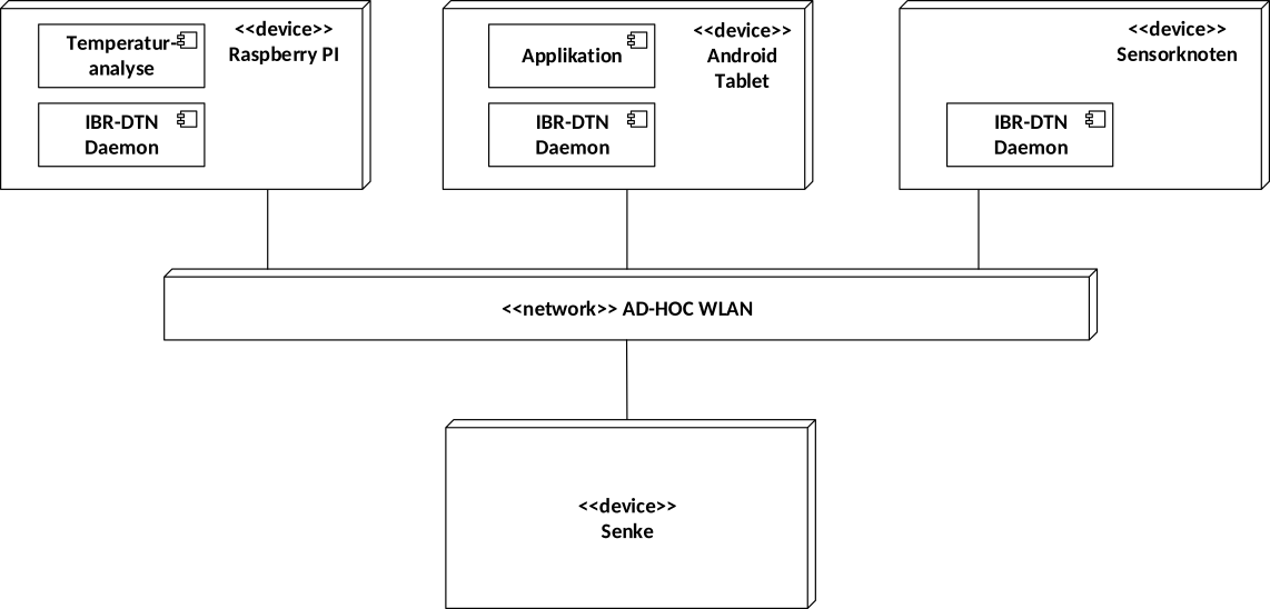 Einleitung und Motivation (Auszug Exposé)Da die Weltbevölkerung immer weiter wächst, stellt die Nahrungsversorgung eine immer größere Herausforderung da. Ein Ansatz dieses Problem zu lösen ist, den bestehenden Landwirtschaftssektor effizienter zu gestalten. Dieses Projekt bietet die Möglichkeit genau zu überwachen an welcher Stelle eines Feldes welche Temperatur herrscht. Diese Daten können es dem Landwirt ermöglichen bessere Entscheidungen bei der Bewirtschaftung des Feldes zu treffen und somit die Effizienz im Anbau zu steigern. Dieses Projekt ermöglicht außerdem die einfache Vernetzung eines auf einem Feld aufgestellten Sensorknoten mit einem Server durch IBR-DTN. Da die Sensorknoten auch Daten zur effizienteren Bewirtschaftung des Feldes sammeln, trägt das Projekt auch an dieser Stelle indirekt zur Lösung des oben beschreibenden Problems bei. Meine persönliche Motivation diese Abschlussarbeit zu bearbeiten, liegt vor allem an meinem Interesse an Android-Applikationen, die durch das SEP und das Teamprojekt geweckt wurde, die sich beide mit Android-Entwicklung beschäftigt haben. Da ich mich außerdem für die Vernetzung und Kommunikation von Geräten untereinander interessiere, bietet diese Abschlussarbeit eine für mich sehr interessante Aufgabenstellung. Aufgabenstellung (Auszug Exposé)In Abbildung 1 ist schematisch ein Versuchsaufbau dargestellt, der eine Feldspritze zeigt, die von einem Traktor über ein Feld gezogen wird. An der Feldspritze sind mehrere Temperatursensoren angebracht, die ihre Daten an einen ebenfalls an der Feldspritze angebrachten Raspberry Pi mit GPS-Empfänger weiterleiten. Zusätzlich befindet sich ein Android-Tablet in der Fahrerkabine des Traktors, das in dieser schematischen Darstellung nicht abgebildet ist. Das entsprechende Verteilungsdiagramm des Systems ist in Abbildung 2 dargestellt und zeigt die verschiedenen Knoten. Der Übersichtlichkeit halber sind in diesem Diagramm nur Komponenten abgebildet, die für diese Arbeit relevante sind. Ziel dieser Bachelorarbeit ist es, die benötigte Software zum Betrieb des Android-Tablets und des Raspberry Pis zu entwickeln und die Funktionsfähigkeit zu evaluieren. Das zu entwickelnde Softwarepaket besteht aus einer Android-Applikation für das Tablet in der Fahrerkabine und einer Anwendung für den Raspberry Pi. Die Anwendung auf dem Pi soll es ermöglichen, die Temperatursensoren auszulesen und zusammen mit den aktuellen GPS-Daten des Pis über IBR-DTN an das Tablet zu schicken. Außerdem muss die Möglichkeit bestehen die Temperaturdaten zu senden, ohne dass ein GPS-Signal vorhanden ist. In diesem Fall werden die GPS-Daten des Tablets verwendet, falls sie vorhanden sind. Die Android-Applikation dient zum einen als Zwischenspeicher für die vom Pi empfangenen Daten und bietet zum anderen die Möglichkeit den Verbund aus Android-Applikation und Pi-Anwendung zu steuern. Die Hauptfunktion hierbei ist, dass am Anfang jeder Fahrgasse ein Knopf gedrückt werden kann, der den Beginn einer neuen Fahrgasse signalisiert. Hierdurch wird es möglich, auch ohne ein GPS-Signal die ungefähre Position auf dem Feld zu bestimmen. Außerdem kann so bei vorhandenem GPS-Signal die Ungenauigkeit der berechneten Position bestimmt werden, da die Koordinaten des Anfangspunktes der Fahrgasse bekannt sind. Die Android-Applikation wird außerdem genutzt, um dem Fahrer eventuell auftretende Fehler und Defekte an den Sensoren zu melden. Eine weitere Funktion der Android-Applikation, die durch das Nutzen von IBR-DTN ermöglicht wird, ist das Erstellen von Statistiken über die Anzahl und Größe der DTN-Bundle, von auf dem Feld aufgestellten Sensorknoten. Diese Bundle werden dann beim Erreichen des Hofes, vom auf dem Tablet laufenden DTN-Deamon, weitergeleitet. Besonderes Augenmerk liegt bei der Implementierung des Softwarepakets auf der Zuverlässigkeit. Das Hauptziel hierbei ist, dass das System am Ende der Bachelorarbeit unter Realbedingungen robust arbeitet. Dies wird durch Tests sichergestellt. | |