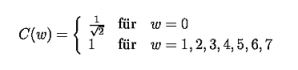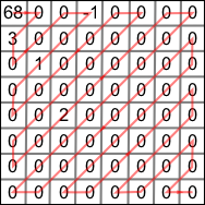 Die Integerfolge 68 0 3 0 0 0 -1 0 1 0 0 0 0 0 0 0 0 0 0 0 0 0 0 2 0 ... 0 aus dem obigen Bild wird z.B. als (0,68) (1,3) (3,-1) (1,1) (14,2) (0,0) codiert.