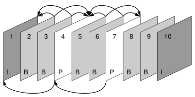 Aufgrund der bidirektionalen Bewegungskompression bei B-Frames ist es bei der Decodierung von H.263, MPEG-1 und MPEG-2 notwendig, die Reihenfolge zu vertauschen. Es müssen also zunächst alle I- und P-Frames, auf die sich die B-Frames beziehen, decodiert werden. Im obigen Beispiel bedeutet dies, dass die Frames in der Reihenfolge 1, 4, 2, 3, 7, 5, 6, 10, 8, 9 übertragen und auch decodiert werden.