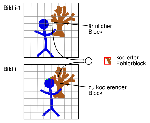 In einer Videosequenz sind sich aufeinander folgende Bilder häufig sehr ähnlich. Diese Ähnlichkeiten werden bei der Inter-Frame-Codierung ausgenutzt, um eine weitere Kompression zu erhalten. Hierbei wird für einen Makroblock des zu codierenden Bildes in einem vorherigen Bild (in gewissen Grenzen) nach einer möglichst großen Ähnlichkeit gesucht. Wird solch eine Übereinstimmung gefunden, so wird nicht der Makroblock, sondern ein Bewegungsvektor, der die Verschiebung bzgl. des gefundenen Blocks des vorherigen Bildes angibt sowie der dadurch entstehende Fehler codiert. Wird keine Übereinstimmung gefunden, so wird der Makroblock mit Hilfe der Intra-Frame-Codierung codiert.