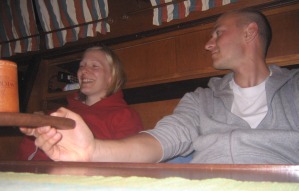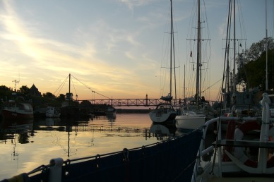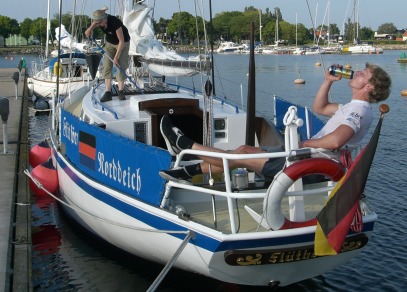 Als wir endlich im Hafen sind, fällt die Liegeplatzwahl nicht schwer. Direkt vor einer Eisdiele liegt ein Hamburger Schiff mit gehisster Astra-Flagge - wir legen uns daneben!Es ist ein Schiff des akademischen Segelclubs und nach einer Runde Bratskartoffeln gehen wir mit den netten Hamburgern in die Innenstadt. Auf dem Marktplatz entdecken wir dutzende Oldtimer, hier ist ein Etappenziel des 'Baltic-Race', ein Oldtimerrennen rund um die Ostsee. Wir trinken ein paar Bier, fachsimpeln übers Segeln und über Fußball und als wir zum Hafen zurückkommen schallt uns wie versprochen die Disko entgegen. Unser aller Aktionspotential ist aber leider mal wieder schon aufgebraucht, wir kriechen in die Kojen. (Vielleicht brauchen wir Urlaub ??) Das Einkaufszentrum ist auch am Sonntag für vier Stunden komplett geöffnet, wir können shoppen. Meine Crew stürmt von Helkes Einkaufsliste gelenkt in den Supermarkt und ich versuche eine prepaid-Handykarte zu kaufen, so dass ich unter einer schwedischen Nummer erreichbar bin. Theoretisch kein Problem. Ich bitte den freundlichen jungen und leicht ahnungslosen Verkäufer die Aktivierung für mich vorzunehmen, da die Begleitschreiben alle auf schwedisch sind. Nach einer halben Stunde ist er genervt hat diverse Telefonate mit dem Betreiber Telia hinter sich und die SIM-Karte ist gesperrt. Seine Kollegin freut sich, findet es witzig - so hätte sie ihn noch nie erlebt... Ich lasse denen erstmal mein Telefon da und suche meine Crew, die mit vollen Einkaufstüten aber ohne Geld an der Kasse des Supermarktes auf mich warten. Ich löse sie aus und geselle mich wieder zu den lustigen Verkäufern. Mit der zweiten SIM-Karte läuft es zunächst besser, bis sich herausstellt, dass ich Schwede sein müsste. Flugs meldet der Verkäufer das Telefon auf seinen Namen an und tatsächlich, es klingelt!
