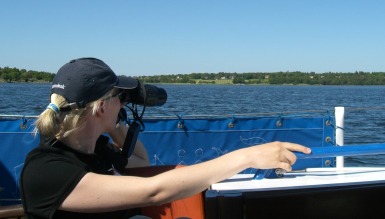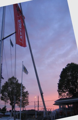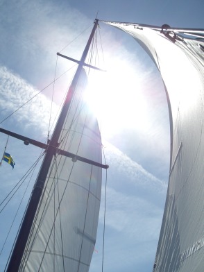 nebenbei versuchen Skat zu spielen. Da wir wieder mal nicht so früh gestartet sind, kommen wir erst um halb 9 an, und die Richtlinie zum Hafen führt genau in die tief stehende Sonne. Kaum im Hafen (56°15.410'N 16°02.695'E) hören wir, dass hier irgendwo schwer was los sein muss: Aus zwei Richtungen schallt live-Musik herüber.Leider dauert es etwas länger bis wir los kommen. Ich habe Waschtag und muss noch alles aufhängen und das zubereiten und verzehren der Pfannkuchen zieht sich auch etwas. Um 12 sind wir endlich soweit, es ist ja Samstag... Aber als ich horchend in der Plicht stehe ist von den Bands nichts mehr zu hören. Auch bei einem kleinen Gang Richtung Zentrum ist keine Menschenseele mehr zu finden. Doofe Schweden :-) Diesmal kommen wir einigermaßen früh los und segeln nach Norden, zwischen Öland und dem Festland, in den Kalmarsund. Nach 10 Meilen das bekannte Ostseespiel. Vier Knoten, drei, zwei, eins, Stillstand. Das Meer ist absolut glatt 'wie schlafender Stahl der geschliffen'...