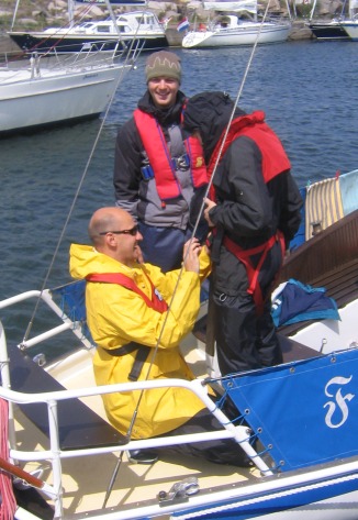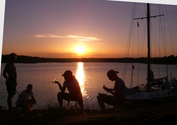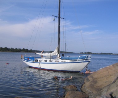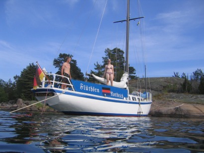 Wind gibt es auch wieder, so dass wir uns am frühen Nachmittag, nach einem dicken Eis, auch wieder auf den Weg machen. Es läuft hervorragend, Spitzengeschwindigkeit von über 7 Knoten! Wir sehen alle anderen Segler in der Nähe zunächst als Regattagegner an, bis Achim feststellt, dass es nur Opfer sind :-)Wir segeln 18sm rüber nach Borgholm, der größten Stadt Ölands. (56°52.809'N 16°38.800'E) Helke zeigt nach dem Anlegen Tatendrang und fängt an das Deck zu schrubben, wir Männer haben es schwer ein trockenes und sonniges Plätzchen zu finden... Kurz nach uns trudeln auch die Hamburger wieder ein, die kamen heut nicht früher los, da ein Mechaniker noch an deren Motor rumtüdeln musste. Heute machen wir aber nichts zusammen, sondern Siedeln ein Ründchen unter Deck. Seit ich vor ein oder zwei Jahren das erste mal auf einem Photo sah, wie die Schweden in den Schären festmachen, träume ich davon, auch an so einem Plätzchen zu liegen. Heute soll es wahr werden. Wir legen zeitig ab und segeln mit Genua, achterlichen Winden und 4 Knoten wieder Richtung Festland rüber. nach 3 Stunden erreichen wir die Einfahrt zum Schärenfahrwasser. Zunächst ist die Navigation einfach, wir müssen nur den Tonnen folgen. Je weiter der Weg aber führt, desto enger wird es. Das Fahrwasser knickt oft ab oder verzweigt sich, direkt hinter den Tonnen sind Steine unter der Wasseroberfläche und der Wind hat aufgefrischt, so dass wir mit 6 Knoten hindurchrasen. Wo müssen wir lang? Links oder Rechts von der Insel? Auf beiden Seiten sind Tonnen zu sehen... Welche sind dichter dran? Wo sind wir auf der Karte? Die Entscheidungen müssen schnell getroffen werden! Immer wieder müssen wir halsen, ein Riesenspaß !!