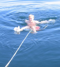 Als aber, mal wieder, die Logge nur noch einen Knoten anzeigt muss was passieren: Der Skipper geht über Bord! In Badehose und mit Rettungsring, welcher hinterhergeschleppt wird. Das erste mal Baden in der Ostsee in diesem Urlaub und hoffentlich nicht das letzte mal. Das Wasser ist noch saukalt aber erfrischend. Einer nach dem anderen lässt sich ein paar Minuten ziehen. Ein Knoten Fahrt kommt einem an Bord saulangsam vor, aber Mibu ist der einzige der es schafft Flüthörn zu umrunden...Nach diesem Spaß sehen wir ein, dass es mit dem Segeln nichts mehr bringt, wir motoren den Rest und gehen im Hafen als drittes Boot längsseits ins Päckchen. (55°19.194'N 15°11.165'E) Der Nachbar hilft und verkündet aber gleich er müsse um 6 Uhr früh los, naja nütschanix. Der zweite Nachbar möchte um 8 starten. Wir verabschieden uns und kündigen einen Landgang an. "Geht nicht zu schnell", werden wir noch gewarnt. Die Erbseninseln haben ihren Namen nicht zu unrecht. Die größte ist ca. 800x400m, die kleinere halb so groß. Beide Inseln sind durch eine Brücke verbunden, die den Hafen in einen Nord- und einen Südteil trennt. Die drittgrößte Inseln ist den Vögeln vorbehalten - das ist deutlich zu hören. Geschrei die ganze Nacht. ![]() Die Nachtruhe, die doch eh schon um 6 und 8 unterbrochen werden muss, wird schon um 3 Uhr gestört. "Da geht einer längsseits" weckt mich Achim. Ich stecke den Kopf raus, da hantieren schon 2 Polen auf Flüthörn herum und machen die Leinen fest. Um 6 wird hier abgelegt, warne ich sie. Das gefällt ihnen nicht und sie legen wieder ab. Nach 2 weiteren versuchen wo anders anzulegen sind sie, als ich das nächste mal den Kopf rausstecke, in einer absolut merkwürdigen Position. Sie liegen senkrecht zu unserem Päcken, mit dem Heck zum Land und an der Seite die Bugspitzen unserer drei Boote. Jetzt sind alle wach und reden auf die Polen ein. Letzendlich legt der Fischer hinter uns ab und die Polen verholen auf dessen Position. Der Nachbar beschließt jetzt schon abzulegen, es sind eh schon alle wach und hell ist es auch schon. Gesagt getan, wir legen die Leinen aufs erste Boot, schmeißen die anderen los und er kann dazwischen herausfahren. Wir ziehen uns wieder ran und können endlich weiterschlafen. Bis um 8, der 6 Uhr Termin ist ja erledigt. Um 8 machen wir es nochmal genauso und liegen nun direkt an der Hafenmauer. Der Pole ist mittlerweile verschwunden...
