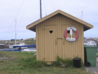 dem einzigen Gebäude, einer kleinen Bretterbude gibt es einen schönen Donnerbalken. Original mit Herzchen in der Tür. Das letzte bischen Hofnung, das Spiel Deutschland - Polen zu sehen erstirbt und wir müssen mit SMS-Berichten von Hanna vorlieb nehmen. Der Hafenmeister kommt singend in einer kleinen Nussschale vorbei und kassiert ein wenig Hafengeld, ein echtes Original, der passt hier in die Einöde!Wir schaffen es noch ein paar Würstchen und Kartoffelpürree mit Sauerkraut anzuwärmen, dann ist auch Schicht, das war ein langer Tag! Die blau-gelbe Gastflagge, eine Leihgabe der Wega, flattert im Wind - Flüthörn ist in Schweden!