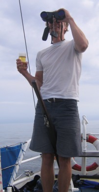 Abends werden die Würfel ausgepackt. Knobeln, Meiern, alte Seefahrergassenhauer (Aloaea...) und die verschiedenen neuen Bacardirumsorten (Oro und Black) lassen sich gut kombinieren. *tilt*Heute soll es rüber nach Schweden gehen. Vor Schweden gibt es einen vorgelagerten Felsen mit Schutzhafen - Utklippan. 43 Meilen sind es bis dahin und um 7 soll es losgehen. Ich stecke um halb den Kopf raus und es weht, entgegen der Vorhersage, kein Lüftchen. Weiterschlafen. Um halb acht prüfe ich erneut, wenigstens etwas, also los. Unter Genua und Groß machen wir zumindest 3 Knoten, Christiansö wird langsam kleiner und wir Frühstücken erstmal. Als dann die Dünung nach 2 Stunden stärker wird, weil Bornholm uns nicht mehr schützt, stürmt Mibu nach oben und hängt sich erstmal über die Reling - das erste Opfer der Ostseetour! Der Rum von gestern hat bestimmt auch ordentlich dazu beigetragen, das war nicht die beste Reisevorbereitung...