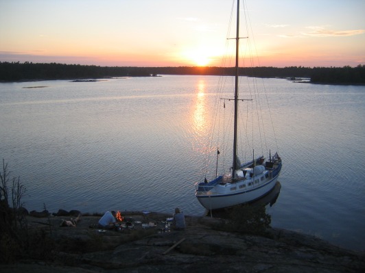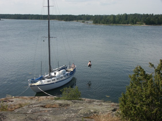 Kurz vor unserem Zielgebiet wird es nochmal viel enger, jetzt holen wir das Segel doch lieber runter und tuckern mit kleinster Fahrt drauflos. Das Fahrwasser wird so eng, wie ein kleiner Kanal, links und rechts bewaldete Inseln, kleine Ferienhäuser, Gartenmöbel am Wasser. An der Insel die unser Zuhause werden soll, geht an einer Stelle die Wassertiefe sofort auf über 3 Meter. Wir machen den Anker klar und Achim schmeißt ihn in 3-4 Schiffslängen Abstand über Bord. Wir nähern uns langsam der Insel... Stop, wir müssen das Ankertau noch einmal verlängern.