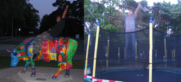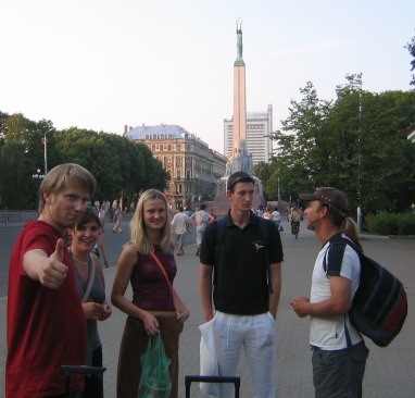 Abschnitt 8: Riga6.-10.7.2006Wir sind tatsächlich in Lettland. Flüthörn wird es zwar zeitmäßig nicht mehr nach Riga schaffen, dafür hängen wir im Zeitplan zu sehr hinterher, aber wir wollen über das Wochenende mit dem Bus hinfahren um Seb abzuholen. Den angebrochenen Donnerstag verbringen wir aber erstmal mit Regeneration von unserem Rekordschlag. Danach schleichen wir, wegen 30 Grad Temperatur und noch letargischem Hirn, ein wenig durch die Stadt um schließlich wieder unter den Sonnenschirmen unserer Hafenkneipe zu landen. Wir essen und trinken und freuen uns über die günstigen Preise: Bier 0.5l für 1,40 Euro... Ich schlafe nochmal 2 Stunden, während Daniel zum Stadtstrand geht, der ist nur ein paar Minuten vom Boot entfernt und schön breit und aus feinem weissen Sand. Abends laufen wir noch ein mal die halbe Stunde in die Stadt und landen in einer Sportsbar. Auch hier sind die Bierpreise, wo wir dazu noch aus Schweden kommen und 5 Euro für ein Bier gewohnt sind, angenehm günstig. Nur der Jägermeister kostet genau so viel wie zu Hause. Stimmt aber nur halb, denn die Standardgröße ist 10cl ! Ein paar Einheimische sehen uns Dart spielen und fordern Daniel heraus. Der hat keinen Plan was er macht oder wie das Spiel das er spielt funktioniert, aber - Löwe halt - er gewinnt zweimal und beschert uns mehr Bier als wir gebraucht hätten. So sind ein farbiger Bullen und ein Trampolin unser Opfer auf dem Heimweg :-)