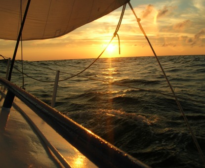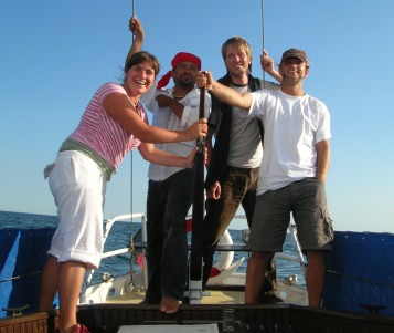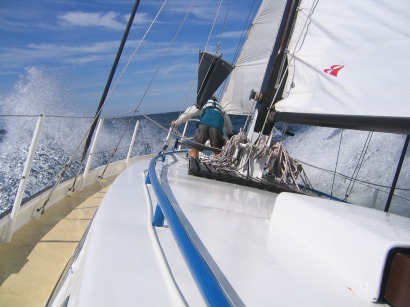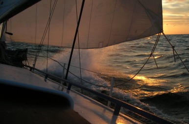 Und die Wellen, die erst recht. Als erster hängt Seb über der Reling, nachdem sein Anfrage "Soll ich jetzt kotzen, oder was?" keine besseren Vorschläge brachte. Nach dem zweiten mal legt er sich hin und macht für den Rest der Überfahrt die Augen sicherheitshalber nicht mehr auf.Mina hält länger durch, doch auch sie wird seekrank. Daniel und ich machen uns zunächst ganz gut. Wir machen uns jedoch Sorgen, wir sind übertakelt, ein Segelwechsel ist fällig, aber bei dem Seegang möchte ich einfach nicht nach vorne, obwohl die Fock schon ständig in die Wellen taucht. Ich hoffe, dass es mit der einsetzenden Nacht abflaut, also kämpfen wir weiter.
