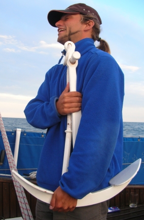 Als wir gegen neun draußen beim Frühstück sitzen wird es wieder unruhiger. Das Boot schaukelt so heftig hin und her, dass wir die Teller festhalten müssen, die anfangen hin und her zu rutschen. 'Toll, dass der kleine Anker trotzdem hält' freue ich mich. Wir gucken uns alle um und es ist sofort klar - tut er nicht. Wir treiben parallel zur Küste ab. Unser klassischer Stockanker pflügt sich durch den Sand. die Schaufel ist völlig blank geschmirgelt, als wir ihn hochziehen, nachdem wir Flüthörn in windeseile startklar gemacht haben.Mit maximal gerefftem Groß und kleiner Baumfock rasen wir los. Dabei sagt der Wetterbericht das gleiche wie am Vortag und da hatten wir Flaute! Normalerweise würde ich es mir bei diesem Wetter zweimal überlegen den Hafen zu verlassen, heute haben wir keine Wahl. Als wir den Schatten von Godska Sandön verlassen, wird uns klar warum es auch vorher schon so geschaukelt hat: Hier sind richtig große Wellen und wir wollen am Wind da durch in Richtung Stockholm. Schon nach wenigen Minuten sehen wir die Sinnlosigkeit unseres Vorhabens ein und drehen um, zurück hinter die Insel um neu zu planen. Hier bleiben ist eine Möglichkeit, aber bei den Wellen würden wir uns nicht ins Schlauchboot setzen, also auf dem schaukelnden Boot eingesperrt sein. So setzen wir ein Handtuch namens Sturmfock und lassen uns vorm Wind zurück nach Gotland pusten.