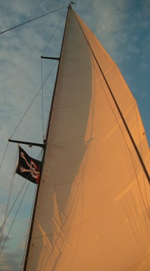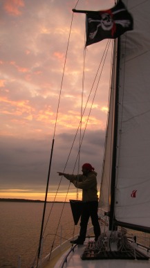Als ich die Fock wechsele und Flüthörn ohne die Stabilisierung der Segel hin und herschaukelt erwischt die Seekrankheit leider Conni. Und wenn man einmal krank ist, wird man es auch meist erst wieder los, wenn man festen Boden unter den Füßen hat. So hängt sie die nächsten 5 Stunden elendig über der Reling, beteuert aber immer wieder, dass sie es trotzdem genießt... Als es dunkel und kälter wird zwingen wir sie endlich, sich unten hin zu legen.Übrigens war die Seekrankheit bei allen meinen Helfern ein einmaliges Phänomen. Wer einmal Stufe drei erreicht hat, der wird nicht wieder Seekrank. Die drei Stufen der Seekrankheit: