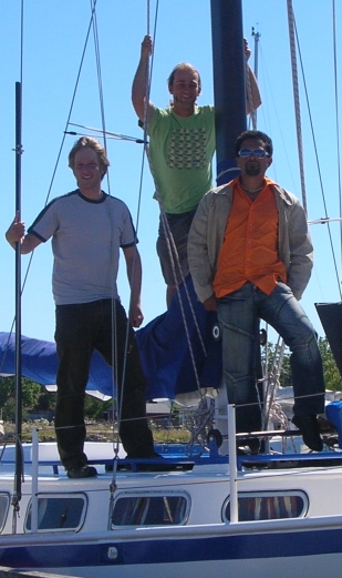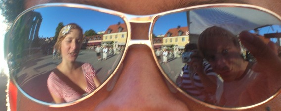 In der Hektik bekommen wir gar nicht mit, wie sehr wir von den für kurze Zeit seitlich anrauschenden Wellen auf die Seite gelegt werden. Nur Romina ist kreidebleich, als wir wieder auf altem Kurs sind...Wir brauchen fünf Stunden, um in den gut geschützten Farösund zu gelangen. Es kommt uns wie eine Ewigkeit vor! Aber kaum sind wir zwischen den Inseln, sind die Wellen nahezu verschwunden - Erleichterung macht sich breit. Mein ohnehin schon großes Vertrauen in Flüthörn ist mal wieder gewachsen: 'Was kann dieses Boot eigentlich nicht ab?' Erkundige ich mich später bei meiner Ma. Wir machen fest und feiern unser aller zweiten Geburtstag. Daniel und Romina kaufen sogar Geschenke für jeden von uns. Allerdings sind wir nun schon zum dritten mal in diesem Hafen. Verflixtes Gotland, wir kommen hier einfach nicht weg! Heute ist wieder ein Crew-wechsel fällig. Seb fliegt morgen von Stockholm nach Hause und Conni steht bereits seit Tagen in Stockholm und den Startlöchern, um Sebs Platz einzunehmen. Gottseidank gibt es eine Fährverbindung von Visby mit Anschlussbus nach Stockholm. So machen wir uns alle mit dem Gotlandbus auf nach Visby. Romina kennt die schöne Stadt ja noch nicht und Daniel und ich waren ja auch zwei Wochen nicht da... Wir treffen Conni direkt am Busbahnhof und machen eine schöne Stadtführung für unsere Visbyneulinge. Um 0:25 Uhr lädt uns der Bus wieder in Farösund ab. ![]() Wir starten unseren dritten Versuch Gotland zu verlassen. Es ist ordentlich Nordwind gemeldet, wir wollen in Richtung Westen zum Festland. Nachdem wir den Sund verlassen haben setzen wir vorsichtig die Segel.