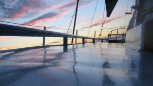 Dann erwischt es auch Daniel, eine überaltete Salami setzt ihn außer Gefecht. Nun sitze ich also alleine in der Plicht, binde mich sicherheitshalber fest, denn es ist verdammt anstrengend so ohne Pause und im dunkeln. Als wäre das alles nicht schlimm genug fällt auch noch das GPS aus, mein Wegweiser durch die Nacht zeigt nichts mehr an. Warum gerade jetzt? Ein Neustart bringt das Gerät wieder auf trab. Uff.Gegen eins kommt Daniel wieder raus und als uns eine dicke Bö erwischt nützt es alles nix, jetzt wird die Fock geborgen. Ich klinge mich mit dem Lifebelt ein und kämpfe eine viertel Stunde mit der Fock, tausche die Onnofock gegen die deutlich kleiner Baumfock. Mein Ölzeug ist von außen und innen durchnässt. Aber der Segelwechsel war nötig, Flüthörn segelt deutlich besser, das Kurs halten ist einfacher. Daniel ist so weit fit, das ich mich für 1.5 Stunden hinlegen kann, dann segel ich den Rest bis Gotland. Als die Sonne aufgeht sind wir mittlerweile in Sichtweite und Wellenabdeckung zur Insel.
