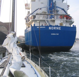 Gegen sechs schrecke ich hoch - Weltuntergang?? Ich stecke den Kopf aus der Luke und muss den Kopf weit in den Nacken legen, um den riesigen Frachter in mein Blickfeld zu bekommen. Direkt vor uns schwenkte er gerade mit seinem Heck und viel viel Schraubenwasser an die Kaimauer. Au Backe! Ich lege zusätzliche Landleinen und hänge alle Fender raus, die wir haben. Dann ist Ruhe, der Frachter liegt und entlädt. Weiterschlafen. Um halb acht dann, beim Ablegen das gleiche Theater. Ich liege gerade wieder in der Koje, da kommt die nächste Störung: Die Hafenmeisterin möchte Geld. Mit der hatte ich hier nun auch nicht gerechnet. Gibt's denn hier gar keine Ruhe? Ich geh lieber Brötchen holen...